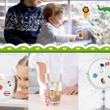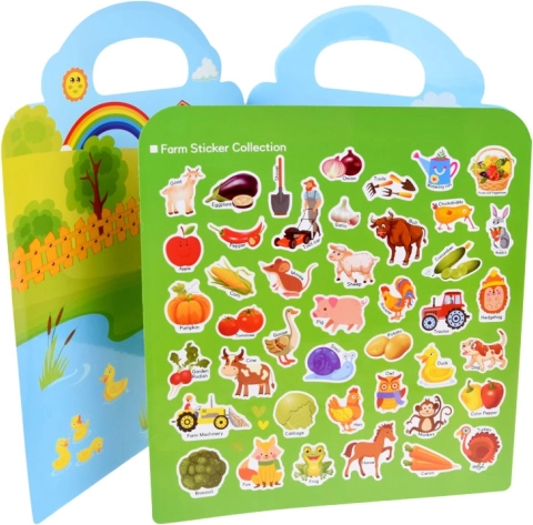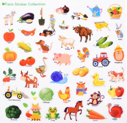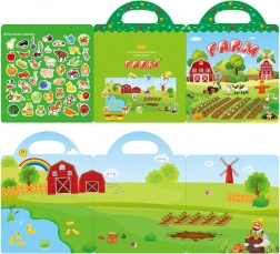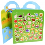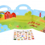 Obsahuje pestré samolepky zvířat a plodin (kozy, krávy, kachny, rajčata, mrkev aj.), které podněcují učení i dekorování.