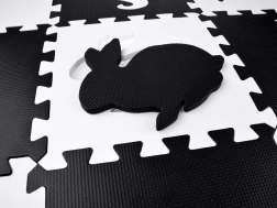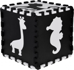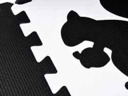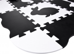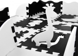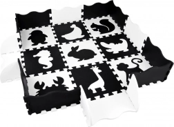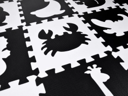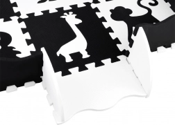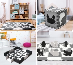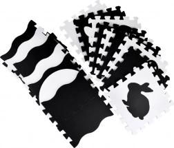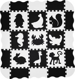 Stylová černo‑bílá pěnová podložka z 16 dílů vytváří bezpečné a pohodlné místo na hraní pro miminka i větší děti. Kontrastní barvy stimulují zrak, měkká EVA pěna tlumí nárazy a oboustranný povrch s protiskluzovou strukturou zvyšuje bezpečnost. Díly lze libovolně skládat, stavět okraje do výšky a vytvářet tak uzavřený prostor pro hračky či míčky.