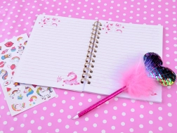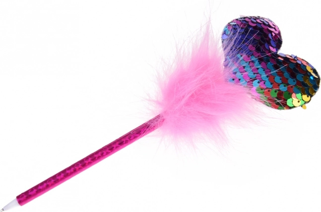 Růžové pero se sequiny a nadýchaným topprem dodává kouzlo každému zápisu.