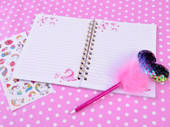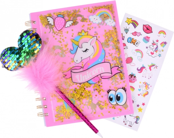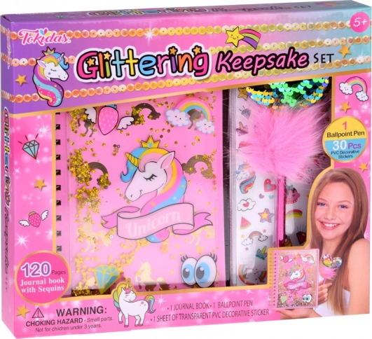 Tento kouzelný deník s motivem jednorožce nabízí ideální prostor pro zapisování vašich myšlenek, tajemství a nápadů. S lesklým obalem posetým třpytivými částicemi dodává deníku jedinečný a přitažlivý vzhled. Lákavá sada obsahuje také růžové pero s nadýchaným pomponem a třpytivým srdcem, spolu s barevnými samolepkami pro kreativní zdobení.