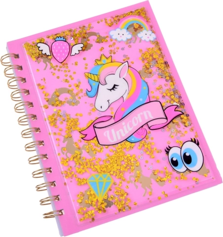 Notebook s růžovým pozadím a zlatým třpytem vyniká svým kouzelným designem, který láká ke psaní i kreslení.