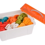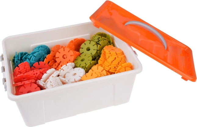 Plastový box s víkem a úchopem usnadňuje skladování a přenášení stavebnice.