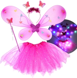Okouzlující dětský set pro převleky se skládá z růžové tutu sukně, motýlích křídel, čelenky a kouzelné hůlky. Díky integrovaným LED světýlkům v sukni i křídlech vytváří kouzelný efekt, který rozzáří každý karneval, oslavu i domácí hraní. Pohodlné pružné pasování a lehký tyl se třpytivými hvězdičkami zaručí pohodlí a fantazii bez hranic.