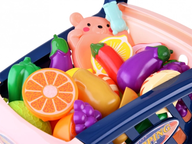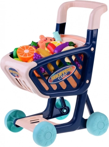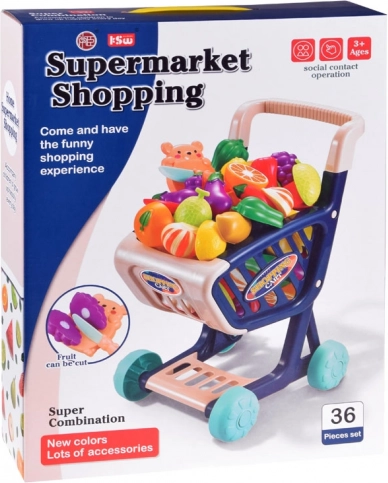 - Nákupní vozík, krájecí prkénko (medvídek), plastový nožík, ovoce a zelenina (např. cibule, brambora, zelená paprika, lilek, chilli paprička, pomeranč, citron, hrozny, kiwi, tropické ovoce)