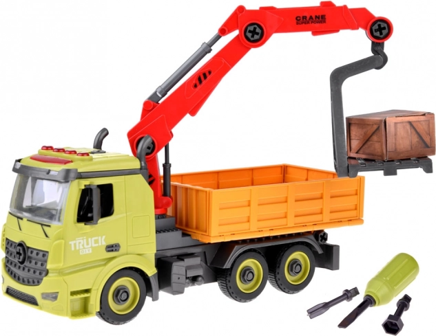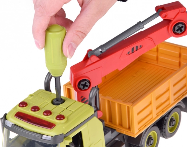 Stavební auto s jeřábem pro malé stavitele nabízí funkční otočné rameno, otevíratelnou korbu a frikční pohon pro jízdu vpřed. Díky přiloženému šroubováku s výměnnými bity lze vůz rozebrat a znovu složit, což rozvíjí jemnou motoriku, trpělivost a kreativitu. Zvukové efekty jako start motoru, klakson a couvání umocní realistický zážitek ze hry.