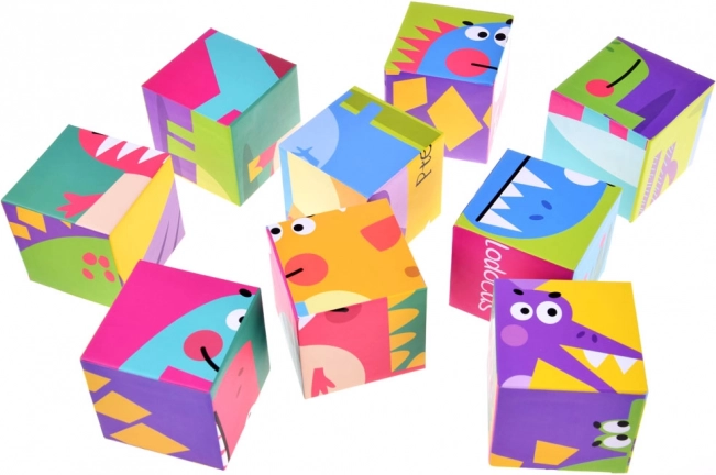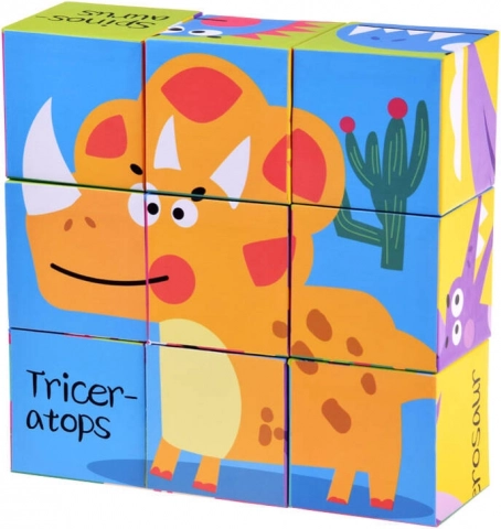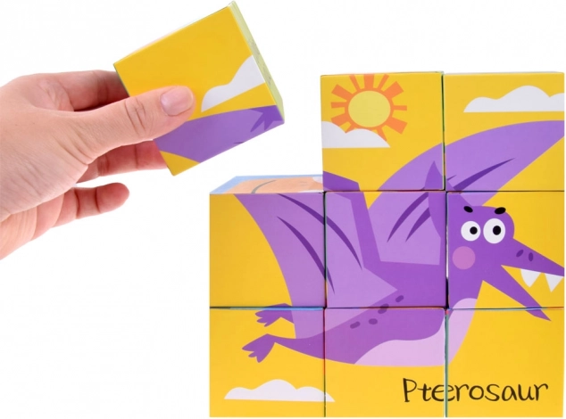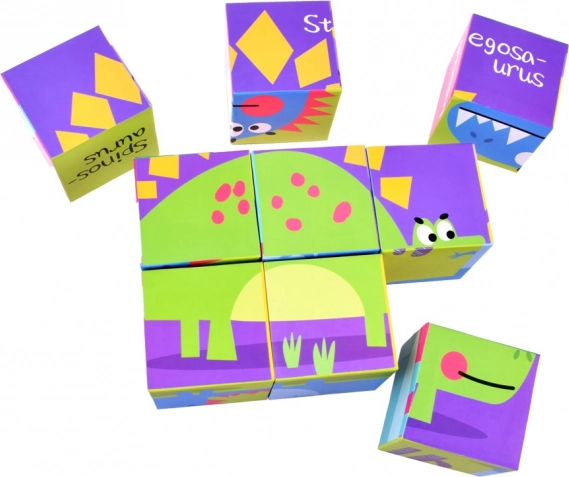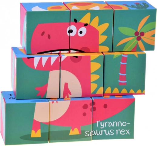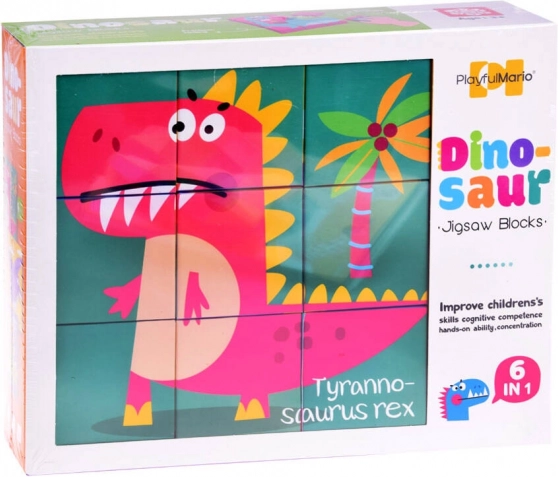 Devět kostek umožňuje sestavit šest různých obrázků dinosaurů pomocí pestrých ilustrací pro snadné učení.