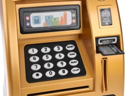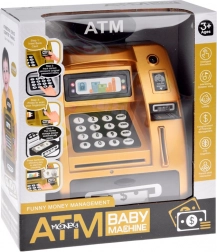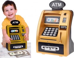 Tento zlatý dětský bankomat přináší zábavným způsobem základní lekce z finanční gramotnosti pro děti. Děti se mohou učit, jak zařídit bankovní transakci s falešnými bankovkami a kartami v přátelském domácím prostředí.