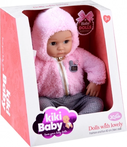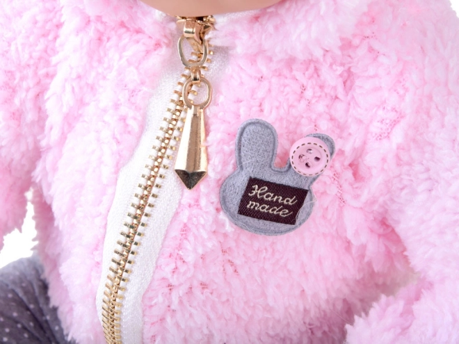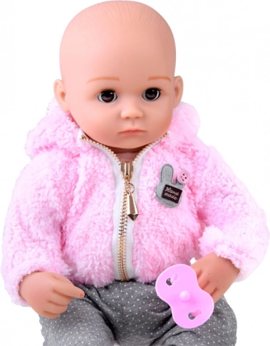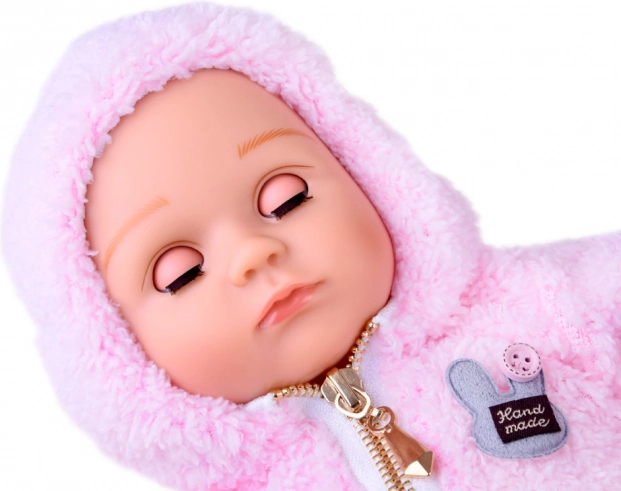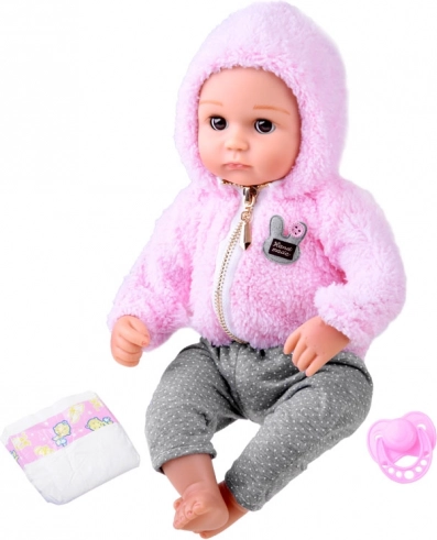 Stylový outfit tvoří plyšová růžová mikina s kapucí na zip a šedé kalhoty s puntíky. V balení najdete také dudlík a plenu, se kterými děti mohou trénovat převlékání a přebalování. Panenka má přibližně 43 cm, skvěle padne do dětských rukou a podporuje rozvoj fantazie, jemné motoriky i socializačních dovedností.