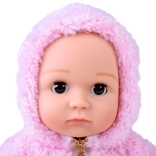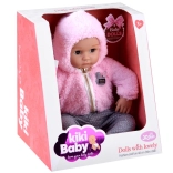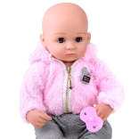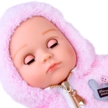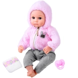 Stylový outfit tvoří plyšová růžová mikina s kapucí na zip a šedé kalhoty s puntíky. V balení najdete také dudlík a plenu, se kterými děti mohou trénovat převlékání a přebalování. Panenka má přibližně 43 cm, skvěle padne do dětských rukou a podporuje rozvoj fantazie, jemné motoriky i socializačních dovedností.