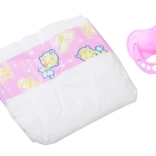 Součástí je dudlík a plenka pro nácvik přebalování, plus hebká růžová mikina s kapucí a šedé puntíkaté kalhoty.