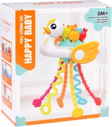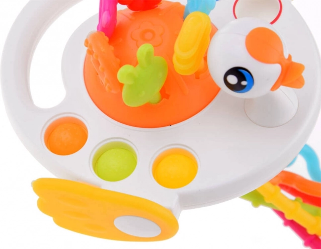 Roztomilá senzorická hračka a kousátko ve tvaru labutě potěší miminka už od prvních dnů. Nabízí různé textury, tahací šňůrky se zvukem a jemnou vibrací, měkká tlačítka i posuvný prvek pro trénink jemné motoriky. Kompaktní rozměry a bezpečné zaoblené hrany z ní dělají ideální hračku na cesty.