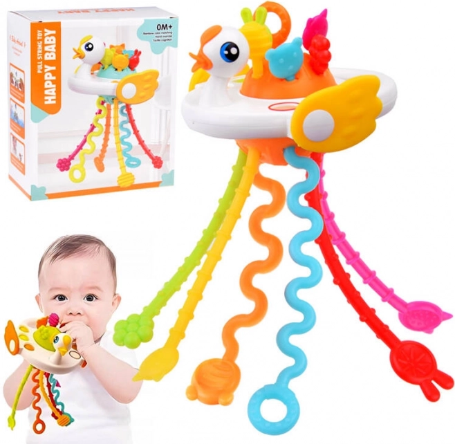 Barevné šňůrky s odlišnými povrchy lákají ke zkoumání, při tažení vydávají zvuky a jemné vibrace – ideální pro senzorickou stimulaci a trénink úchopu.