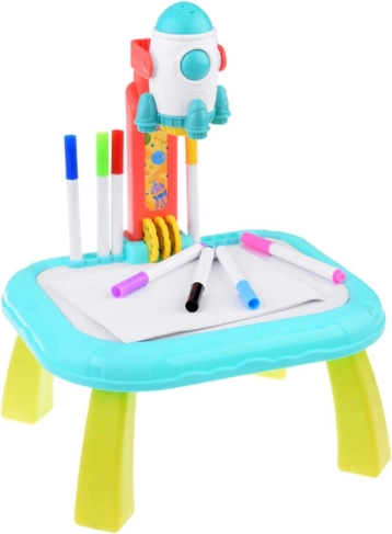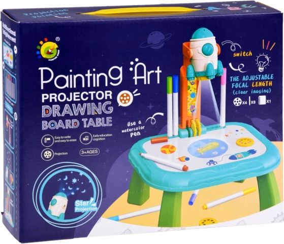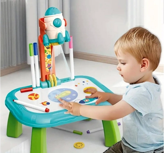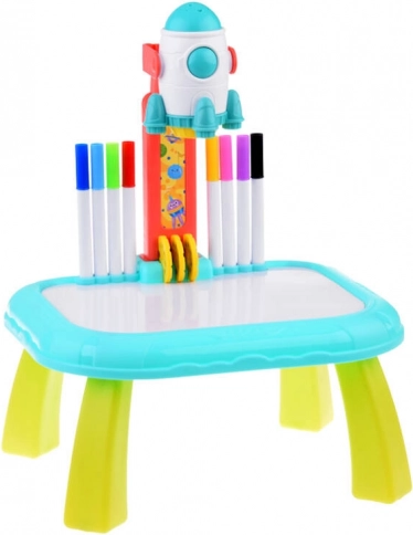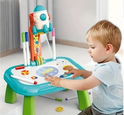 Probuďte dětskou fantazii s projekčním stolkem Kosmos. Díky projektoru ve tvaru rakety se na plochu nebo na stěnu promítají obrázky, které děti snadno obkreslí a naučí se správným tahům. Hračka rozvíjí kreativitu, jemnou motoriku i soustředění, ideální pro děti od 3 let.