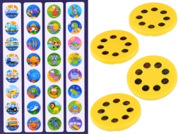Součástí je 8 barevných fixů, 4 motivové disky (vesmír, zvířátka, vozidla, podmořský svět), zásoba papírů a stabilní kreslicí tabule – nic dalšího není potřeba.