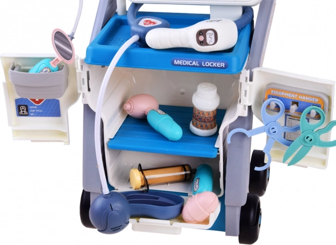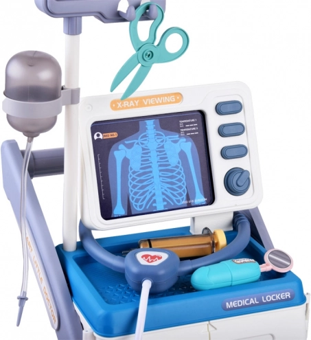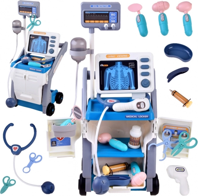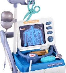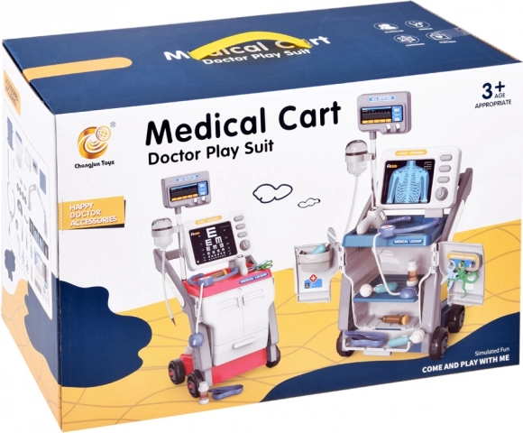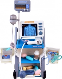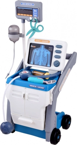 Tento stabilní lékařský vozík na kolečkách nabízí dětem vše, co potřebují pro hru na doktora: monitor s kartami pro "rentgen" a vyšetření zraku, úložnou skříňku s výsuvnou přihrádku a mnoho bezpečných plastových nástrojů v přátelských barvách. Interaktivní panel po vložení baterií vydává zvuky monitorování životních funkcí, teploměr krátce pípne a rozsvítí se a stetoskop umožní slyšet tlukot srdce.
