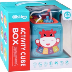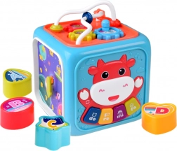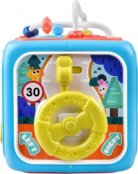 Tato multifunkční aktivní kostka zdokonaluje dovednosti dětí formou hry. Děti si procvičí manipulační schopnosti na bludišti s korálky a ozubenými kolečky, naučí se třídění tvarů díky sorteru a s pomocí hodin s pohyblivými ručičkami mohou objevovat denní režim a první poznávání času.