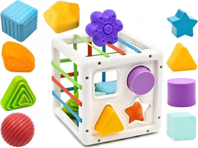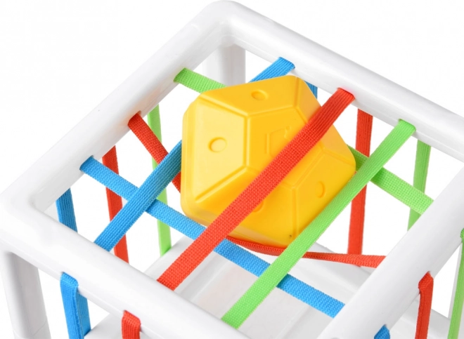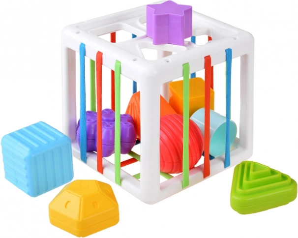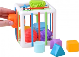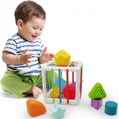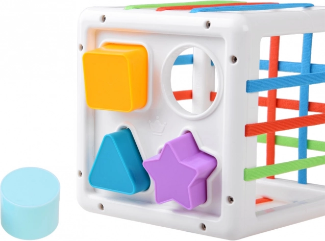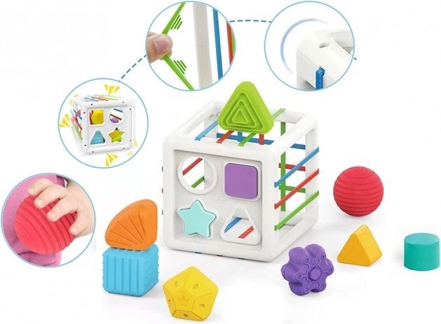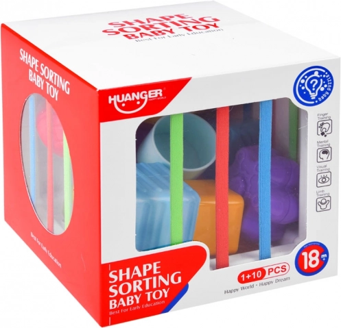 Tato edukativní vkládačka nabízí dětem spoustu smysluplné zábavy – vkládání a vytahování dílků přes barevné pružné pásky i skrz tvarované otvory. Díky pestré paletě tvarů (trojúhelník, čtverec, kruh, hvězda, koule, květ, pětiúhelník aj.) si děti procvičí rozpoznávání tvarů a barev a přirozeně rozvíjejí jemnou motoriku.