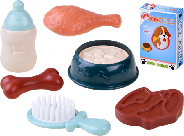 Součástí sady je miska s imitací krmiva, láhev, kartáč, kost, kuřecí stehno, steak, krabička s krmivem a samolepky – vše pro realistickou péči.