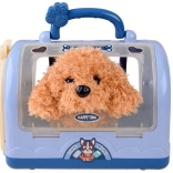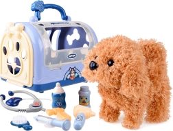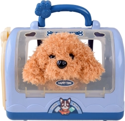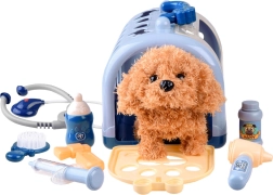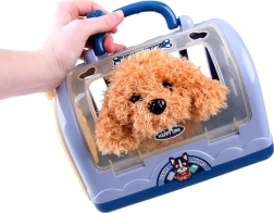 Roztomilý interaktivní plyšový pejsek v přenosném transportním boxu potěší všechny malé milovníky zvířat. Set obsahuje stetoskop, injekční stříkačku, otoskop, neurologické kladívko, kartáč, lahvičku a další doplňky pro hraní na veterináře. Pejsek chodí, štěká, vrtí ocáskem a po pohlazení po hlavě vydává štěněcí zvuky – ideální hračka pro rozvoj empatie a fantazie.