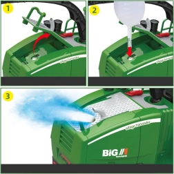 Největší atrakcí je realistická funkce kouře – stačí doplnit vodu z přiložené lahvičky, aktivovat kouř na ovladači a z výfuku se vyvalí jemná pára s podsvícením. Pohyblivý žací adaptér má rotující nahrnovač, lze jej zvedat a spouštět, rameno výsypky se otáčí o 360°. Zadní náprava je poháněná a umožňuje nastavení sbíhavosti. Široká gumová kola zajišťují stabilitu a trakci.