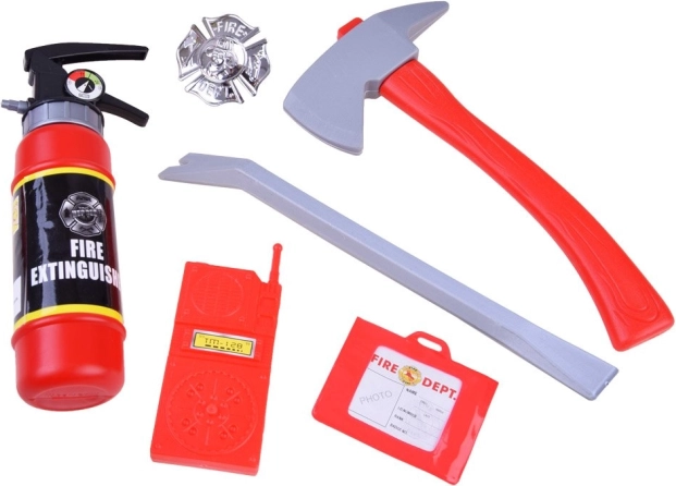 Sekerka, páčidlo, vysílačka, odznak a průkaz hasiče – malý záchranář má vše, co potřebuje k realistické hře.