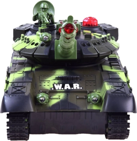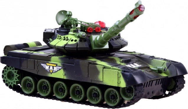Užijte si akční souboje s RC tankem v lesním maskování. Model zvládá jízdu vpřed/vzad, otáčení na místě a má otočnou věž o 180° na každou stranu (celkem 360° pokrytí). Při zásahu se rozsvěcí/zhášejí kontrolky stavu bitvy a tank simuluje realistický odhoz (zpětný ráz), který umocňuje atmosféru skutečného bojiště.