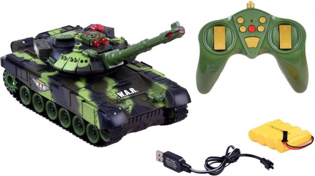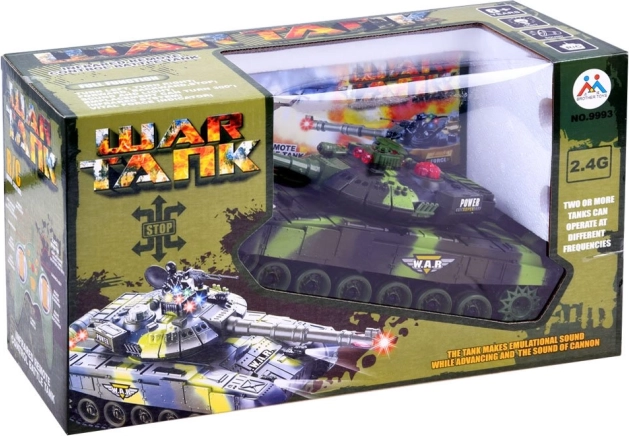 - Kompletní výbava v balení: RC tank, multi-funkční ovladač, USB nabíječka, akumulátor do tanku, figurka tankisty s kulometem.