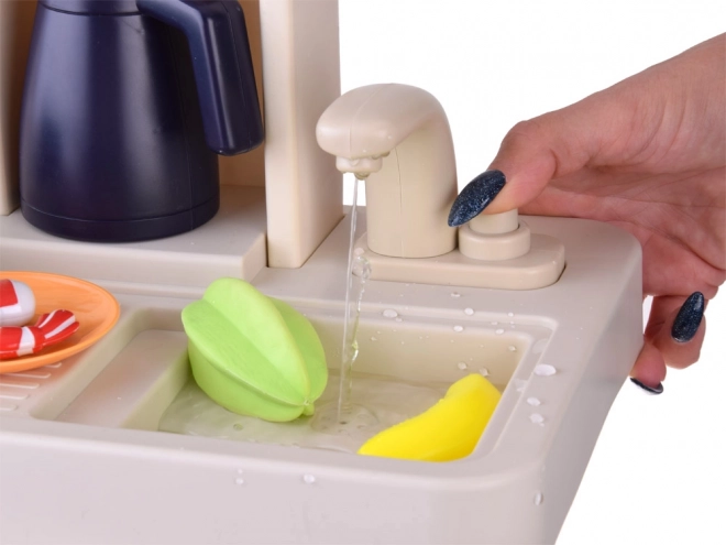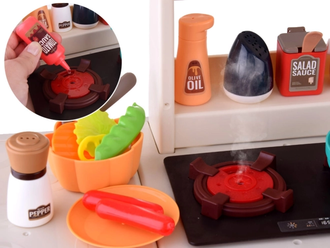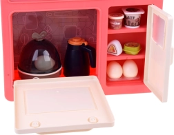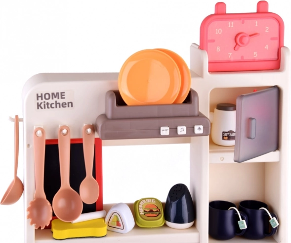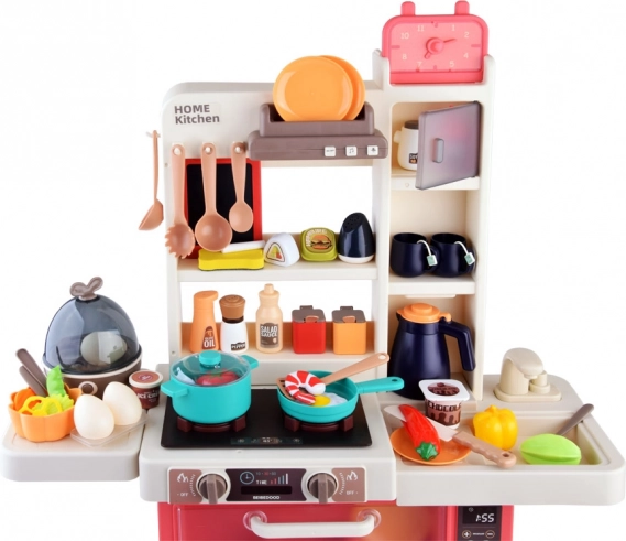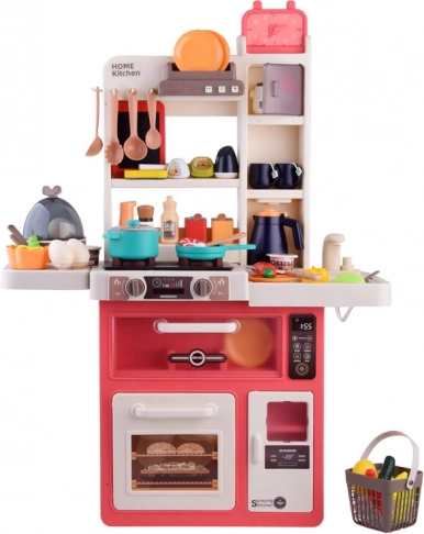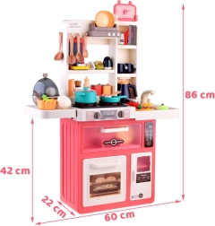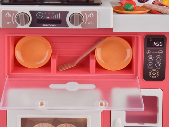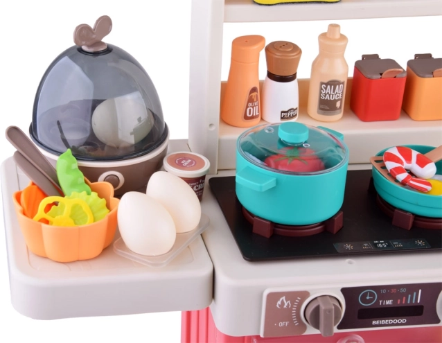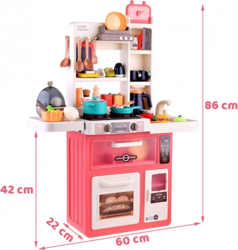 Tato volně stojící kuchyňka v krémovo-růžovém provedení promění dětský pokoj v malou domácnost. Sporák vytváří zvuky vaření a bublání, doplněné LED světly a bezpečnou studenou párou pro ještě realističtější zážitek. Horní panel s podsvícenými tlačítky přehrává veselé i uklidňující melodie a simuluje odsávání par.