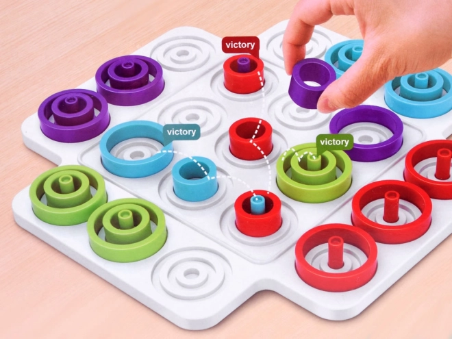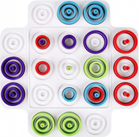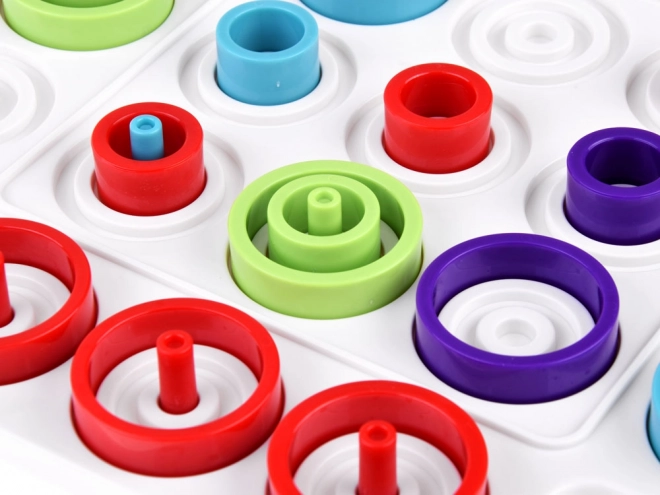 Barevné kroužky a kolíky podporují koordinaci oko–ruka, prostorovou představivost i soustředění – ideální pro děti i dospělé.