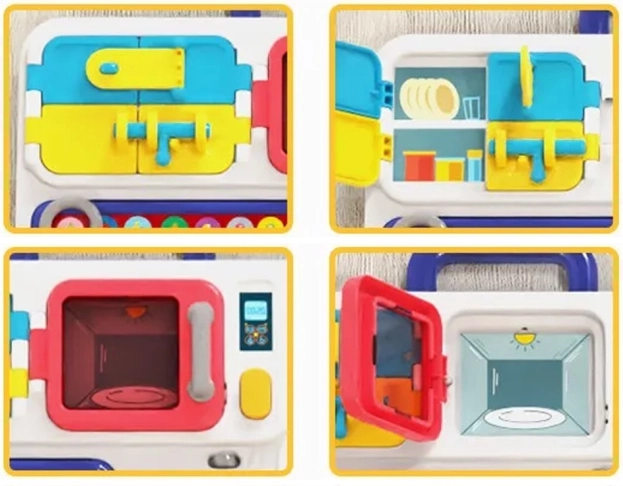 Sada obsahuje mikrovlnku, sporák a další kuchyňské prvky s funkcemi, které simulují skutečné zvuky a efekty vaření.