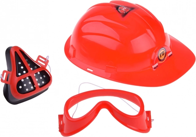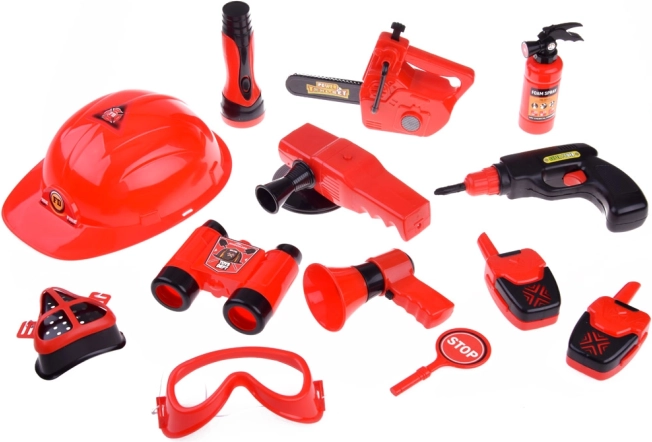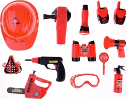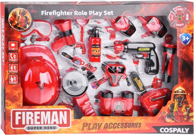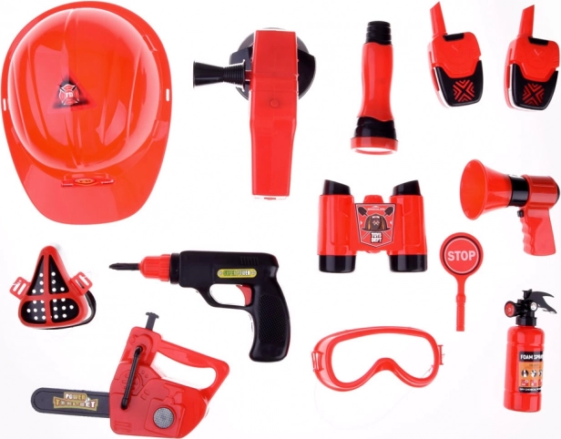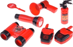 Součástí sady je vše potřebné pro hru na hasiče: přilba, lornetka, megafon, maska, a další bezpečnostní doplňky.