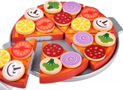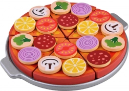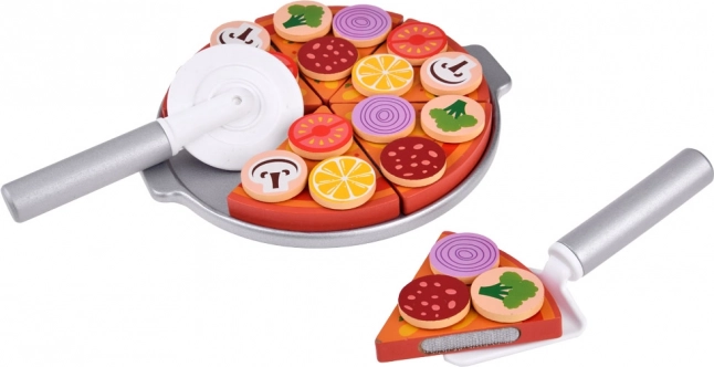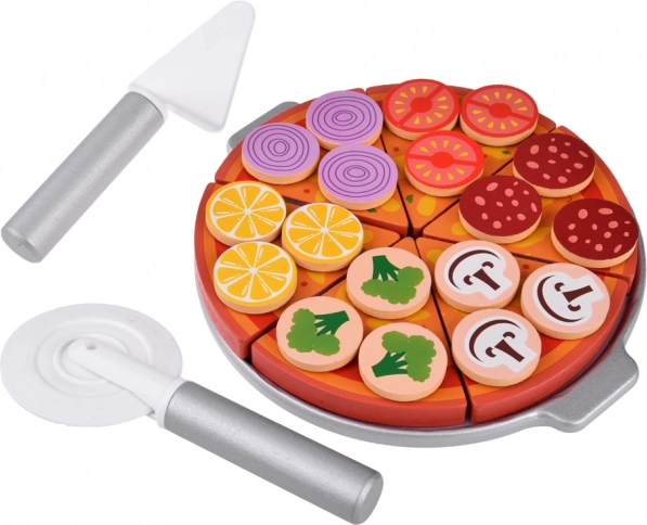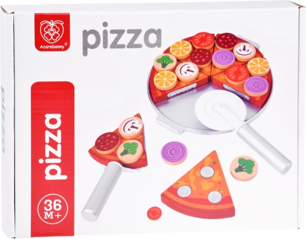 Tento dřevěný pizza set nabízí dětem možnost stát se šéfkuchařem ve vlastní pizzerii. S 27 dřevěnými kousky, včetně různých barevných doplňků, děti mohou vytvářet a podávat pizzu podle své fantazie. Kousky pizzy jsou spojeny suchým zipem, což umožňuje snadné krájení a opětovné sestavení.