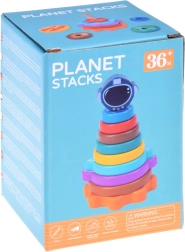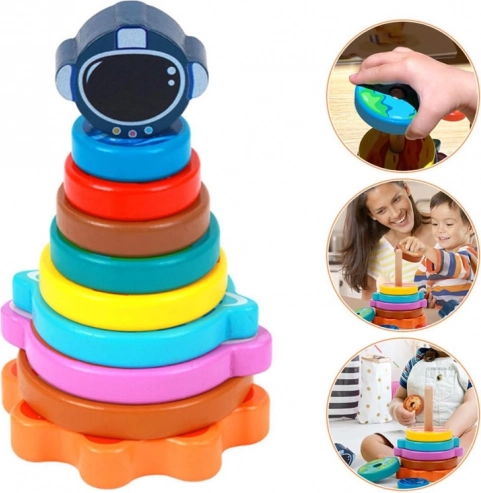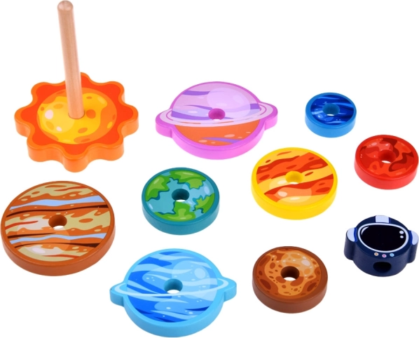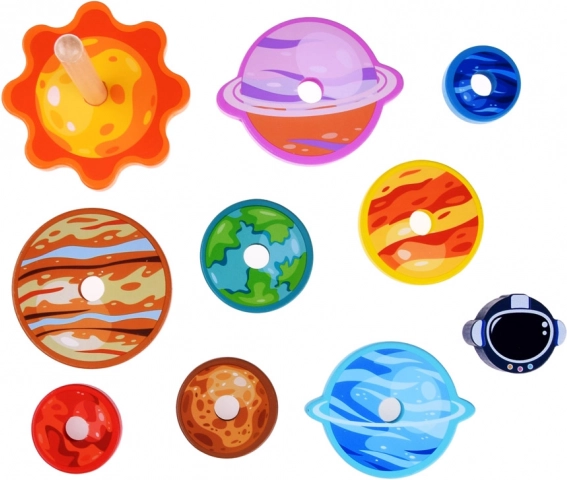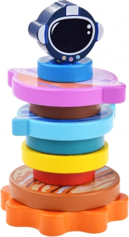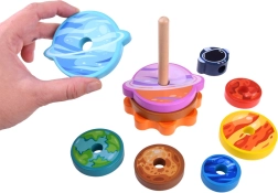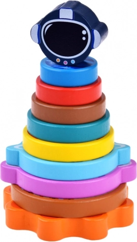 Dřevěná skládanka s vesmírným motivem je ideální hračka pro děti, které milují objevování nových věcí a zdokonalování svých manuálních dovedností. Díky této skládance se děti naučí řadit disky podle velikosti od největšího po nejmenší, přičemž pyramidku korunuje dílek ve tvaru astronautské helmy.