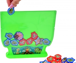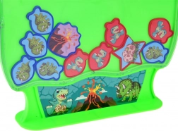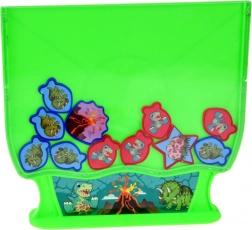 Pevná plastová „klatka“ s motivem dinosaurů a sopky je hlavní scénou hry. Vhozené žetony se bezpečně usazují uvnitř, takže je hra přehledná, rychlá a bez zbytečného nepořádku.