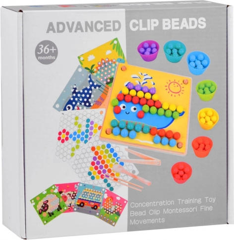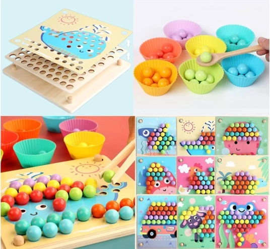 Barevná montessori ukládačka s dřevěnými kuličkami rozvíjí jemnou motoriku, koordinaci ruka–oko a poznávání barev a tvarů. Děti vytvářejí obrázky podle šablon nebo vlastní fantazie pomocí pinzety, hůlek a dřevěné lžičky. Skvělá didaktická hračka pro soustředění, trpělivost a kreativitu.