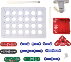 Základna s šestiúhelníkovou mřížkou, barevné díly a přehledné zapojení usnadňují první pokusy s elektronikou i mladším dětem.
