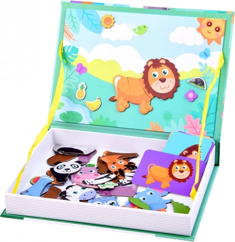 Zábavná a vzdělávací magnetická kniha se zvířaty ze ZOO rozvíjí tvořivost a jemnou motoriku dětí. Pomocí 47 magnetických dílků mohou malé ruce skládat zvířata podle předloh nebo vytvářet vlastní veselé kombinace. Praktické pevné kartonové pouzdro ve tvaru knihy je ideální na cesty i na doma.