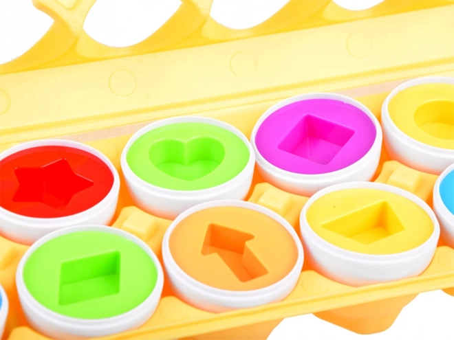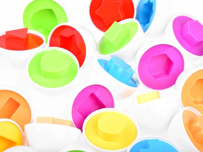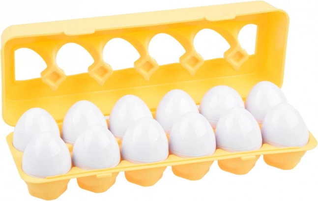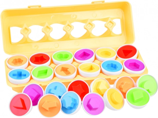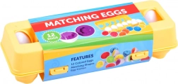 Tato chytrá sada obsahuje 12 bílých vajíček ukrytých v žlutém plastovém plato. Uvnitř najdou děti různobarevné poloviny s tvary, které je třeba správně spárovat podle barvy i tvaru (např. hvězda, srdce, kruh, čtverec a další). Hra podporuje raný rozvoj dovedností, učí trpělivosti a soustředění.