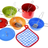 Barevný kovový set pro malé kuchaře přináší realistickou hru na vaření. Obsahuje hrnce, pánev, cedník i náčiní a je ideální pro rozvoj fantazie, jemné motoriky a rolové hry v dětské kuchyňce.