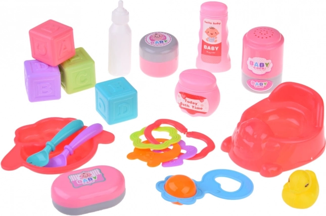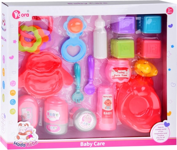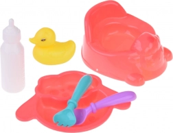 Tato sada dětských hraček nabízí vše, co malá maminka potřebuje pro péči o své panenky. Obsahuje základní nástroje pro role-playing, jako je nočník, talířek se lžičkou a vidličkou, a také různé lahvičky a kachničku na koupání. Každá z těchto rekvizit je navržena tak, aby podporovala představivost a motoriku dětí.