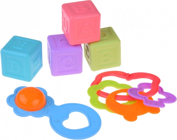 Sada obsahuje prvky, které pomáhají při rozvoji jemné motoriky a koordinaci oka a ruky, jako jsou barevné kachničky a různé hračky na stavění.