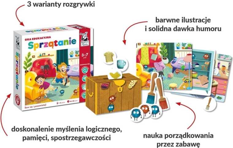 Zábavná rodinná hra Kapitan Nauka – Úklid promění domácí pořádek v veselou hru, ne v povinnost. Děti budou třidit předměty podle druhu, velikosti a barev, rozvíjet logické myšlení, paměť, postřeh i reflexy. Tři varianty – memory, kooperativní a kompetitivní – zajistí zábavu pro jednoho i více hráčů.