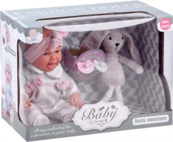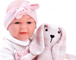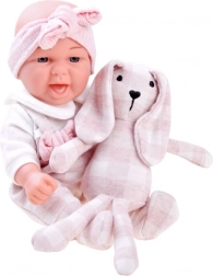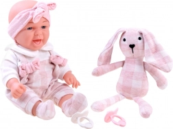 Tato roztomilá panenka – miminko je oblečená do bílo‑růžového kompletu s hebkou čelenkou, košilkou spojenou s kostkovanými kraťásky a bílými ponožkami. V sadě najdete také měkkého plyšového králíčka se vyšívanými očičky a nosíkem a dva dudlíky (bílý a růžový). Vše je sladěné do jemné růžovo‑bílé palety, která působí něžně a čistě.