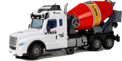 Bílo‑červená míchačka s realistickými detaily, pohyblivou „grušku“ a hladkým chodem kol podporuje skutečnou staveništní atmosféru při hře.