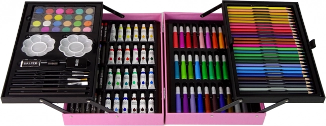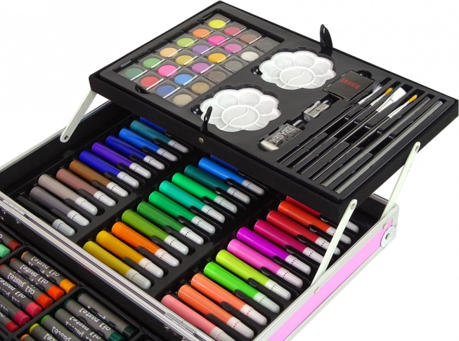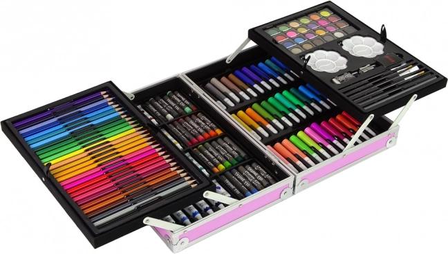 Tento bohatý výtvarný set s 145 díly potěší malé i velké umělce. Nabízí širokou paletu sytých barev a více technik – od kresby přes vybarvování až po akvarelové malování. Vše je bezpečně uložené v pevném růžovém kufříku s motivem jednorožce, který se snadno zavírá a přenáší.