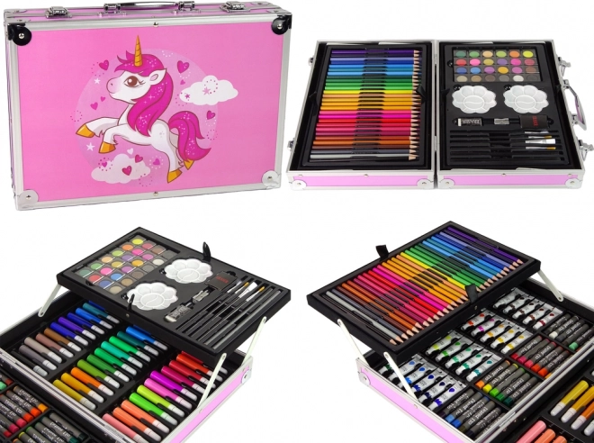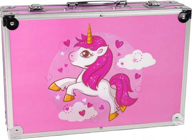 Růžový kovový kufřík s roztomilým jednorožcem nadchne malé výtvarníky a motivuje je k dalšímu tvoření.