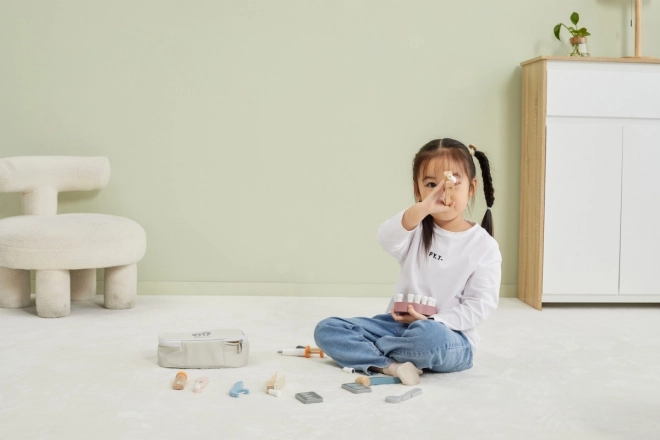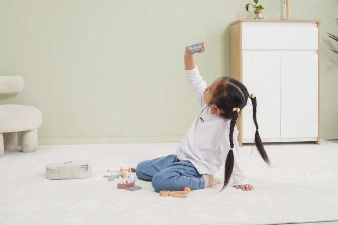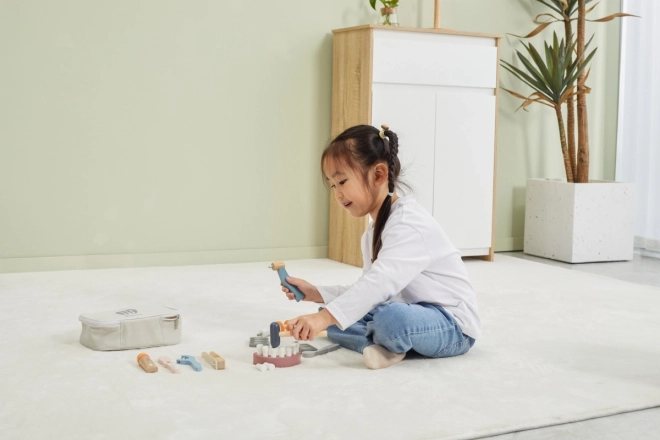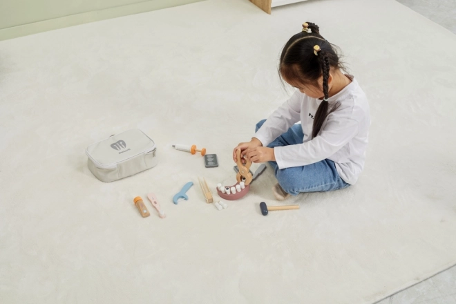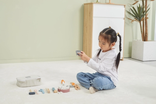 Vše je uloženo v odolné přenosné tašce, takže se sada snadno přenáší i uklízí. Kvalitní lakované dřevo a netoxické barvy zajišťují bezpečnou a dlouhotrvající zábavu. Ideální dárek pro malé zubaře a zubařky.