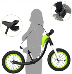 Nastavitelná výška sedla (cca 31–38 cm) roste s dítětem a ergonomicky tvarovaná řídítka s protiskluzovými rukojeťmi přidávají jistotu při řízení. Nechybí ochranný gumový kryt na rámu pro vyšší bezpečnost. Rodiče ocení popruh pro přenášení a chytrý schovánek v sedle, který pojme popruh i drobnosti.