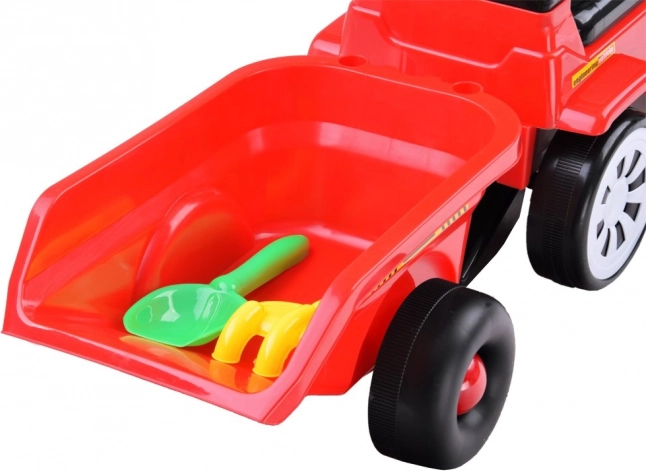 Součástí je odpojitelný přívěs s držáky na lopatku a hrabičky. Děti si mohou vozit hračky, písek či drobnosti na zahradě i doma.