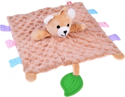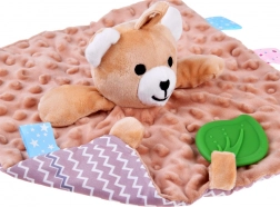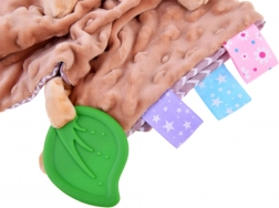 Tato měkoučká přítulka kombinuje komfort mazlící dečky a smyslovou hračku. Dítě zaujmou různorodé textury, šustící a pískací elementy i barevné štítky po okrajích, které lákají k dotýkání, muchlání a tahání. Zelený silikonový list slouží jako kousátko a pomáhá masírovat citlivé dásně při prořezávání zoubků.